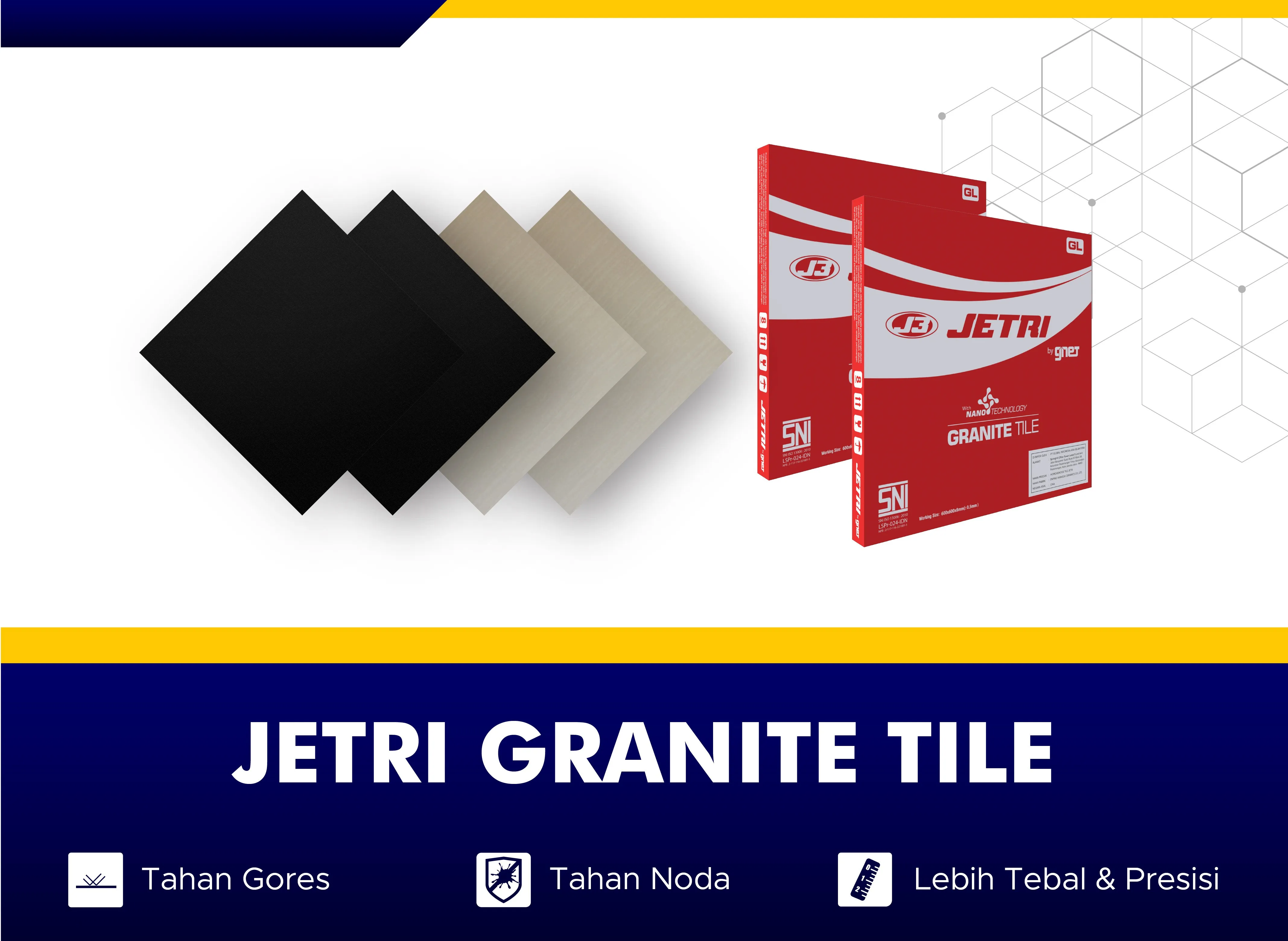 1. Jetri Granite Tile dirancang dengan teknologi canggih yang menjamin permukaannya tahan gores. Anda tidak perlu khawatir dengan goresan yang mungkin terjadi akibat aktivitas sehari-hari, sehingga lantai tetap terlihat baru dan berkilau untuk waktu yang lama.