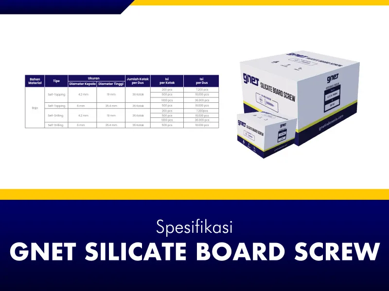 GNET Silicate Board Screw merupakan sekrup khusus yang dirancang untuk memudahkan pemasangan papan silikat secara praktis dan efisien. Diproduksi dengan presisi tinggi di setiap sisi serta dilengkapi lapisan anti karat, sekrup ini memberikan hasil pemasangan yang kuat, rapi, dan tahan terhadap korosi dalam jangka panjang.